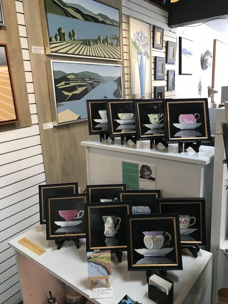 — Art on Oak (210 Oak St., Hood River, OR) exhibited “Cumulus Rising Over Mt. Adams” in the window of the gallery. My teacup paintings and geometric landscapes were at the front of the space as well. “Cumulus Rising” SOLD.